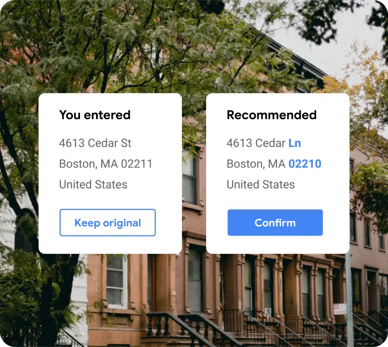 住所を構成要素に分割し、フォーマットエラーを修正し、住所が実際に存在することを検証し、住所を追加データで補足することで、Address Validation APIは、お客様のビジネスがコストのかかる遅延や配送ミスを未然に回避するのに役立ちます。
